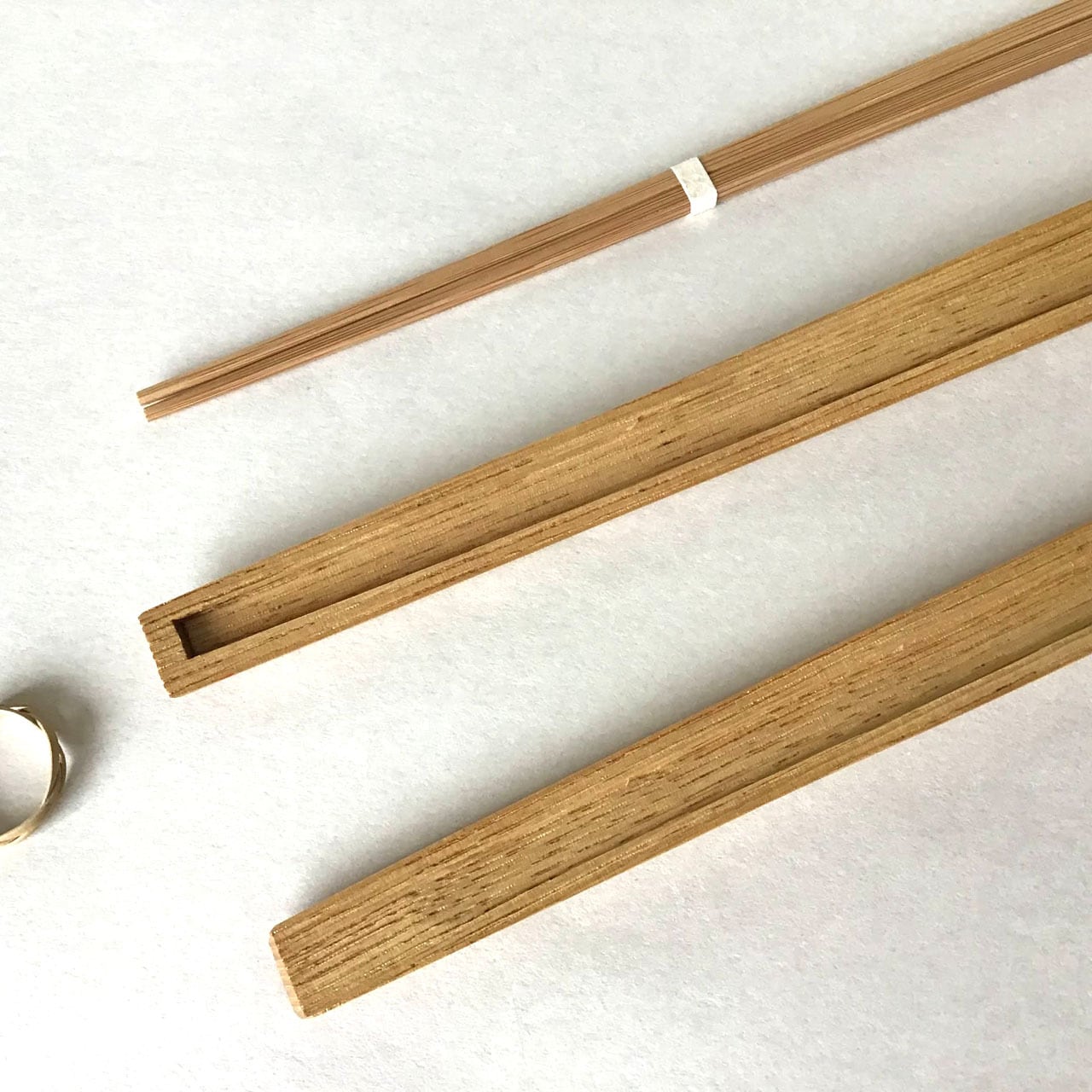 栗の木の気持ちよく割れる性質を生かしたイッピンで、白木の仕上げです。中は竹の箸。