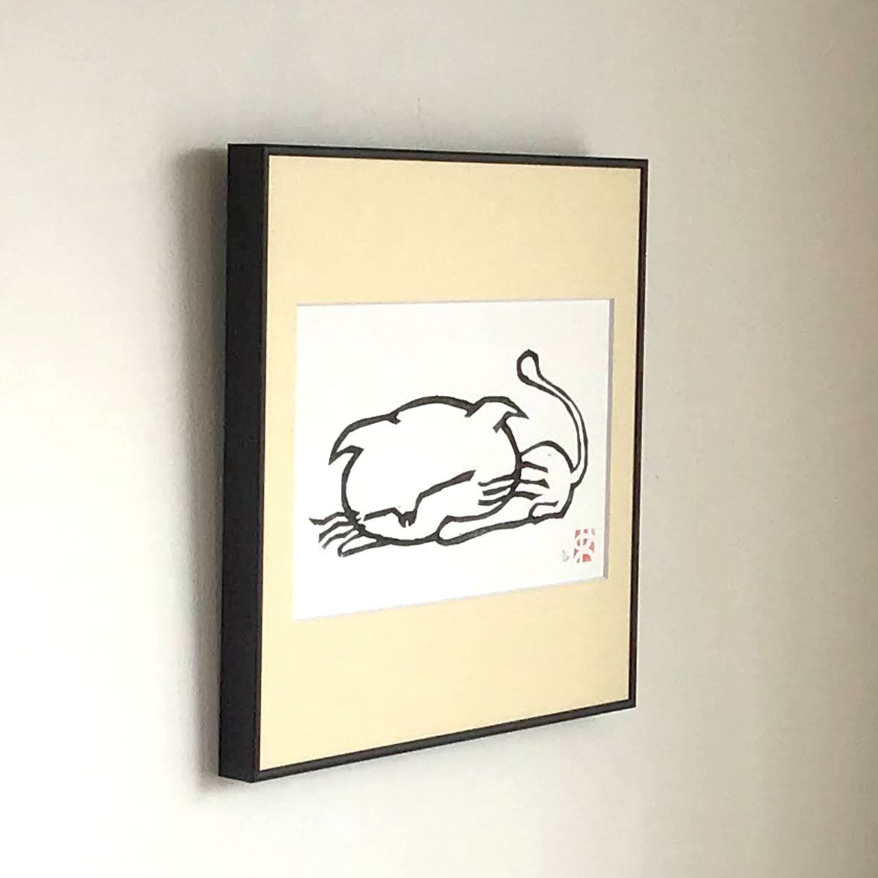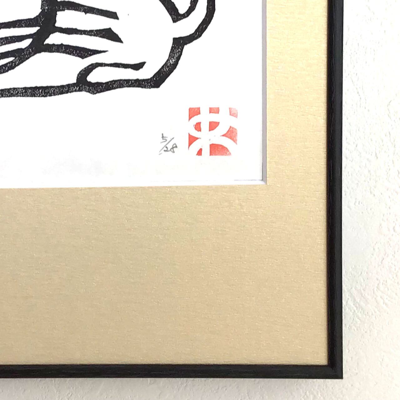 杜のねこ 連作のうち「眠る」 木版画 ブラックフレーム