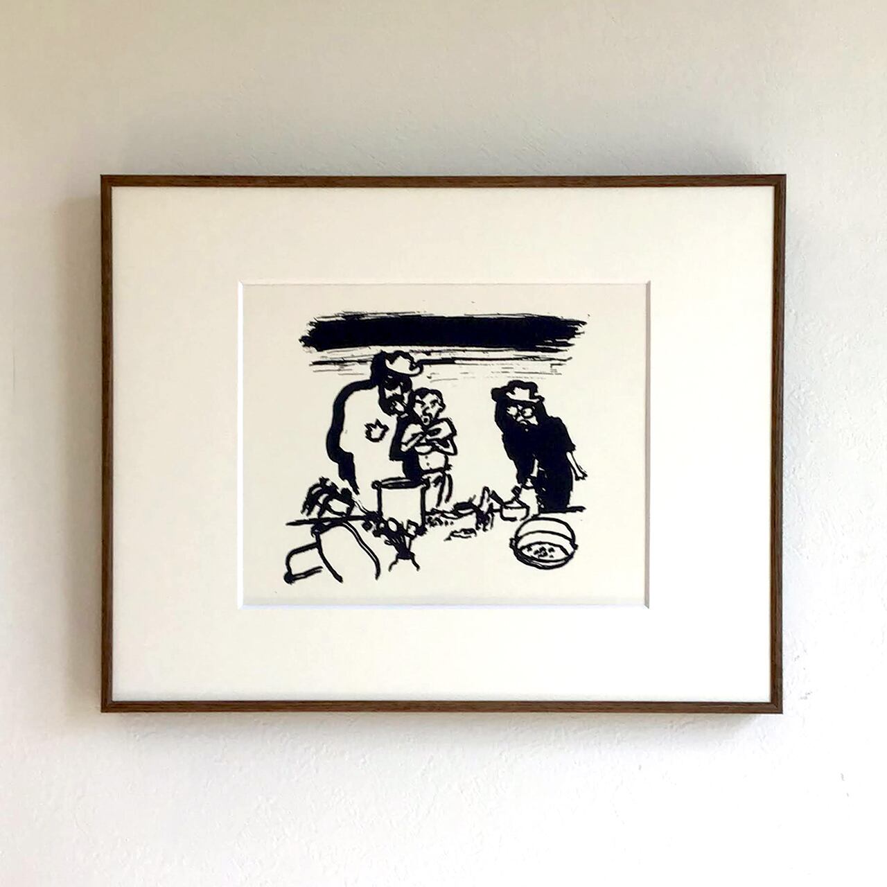 かつてギャラリー杜間道で個展を開催したことがあり、それがご縁でいただいた作品です。児童書で描く絵とは違った独特のユーモアと描写力が素晴らしいです。シンプルな絵は楽しく、どんな場所にも合いやすく飾りやすいのではないでしょうか。