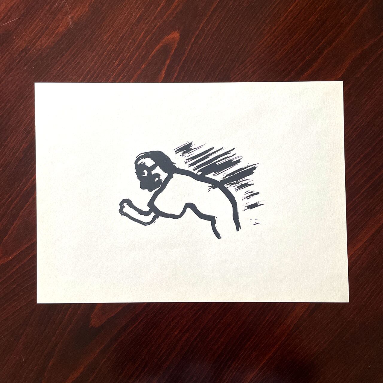 かつてギャラリー杜間道で個展を開催したことがあり、それがご縁でいただいた作品です。児童書で描く絵とは違った独特のユーモアと描写力が素晴らしいです。シンプルな絵は楽しく、どんな場所にも合いやすく飾りやすいのではないでしょうか。