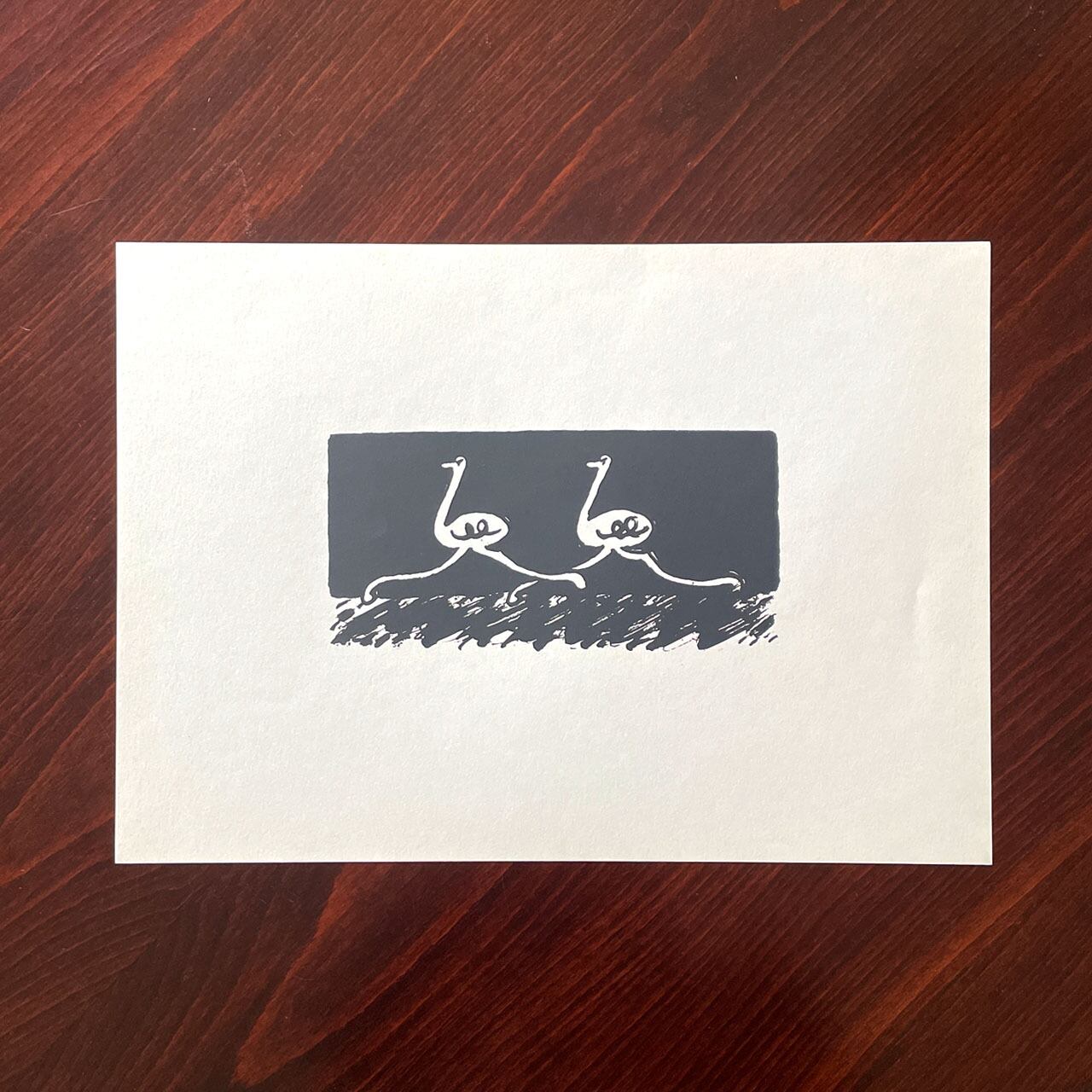 かつてギャラリー杜間道で個展を開催したことがあり、それがご縁でいただいた作品です。児童書で描く絵とは違った独特のユーモアと描写力が素晴らしいです。シンプルな絵は楽しく、どんな場所にも合いやすく飾りやすいのではないでしょうか。